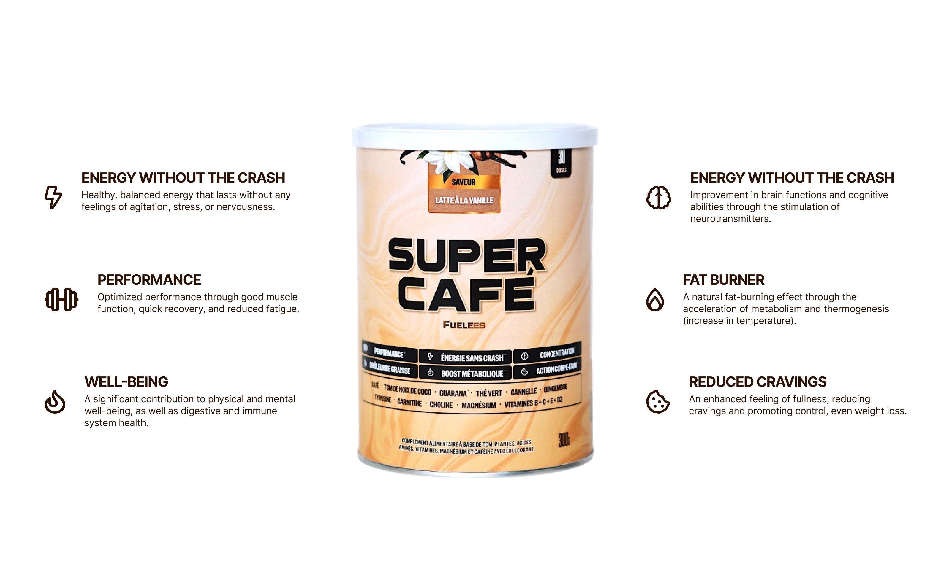 Supercafé by Fuelees is much more than just coffee—it's a delicious Vanilla Latte, quick to prepare, cost-effective, and packed with functional benefits to support a healthy, active lifestyle.